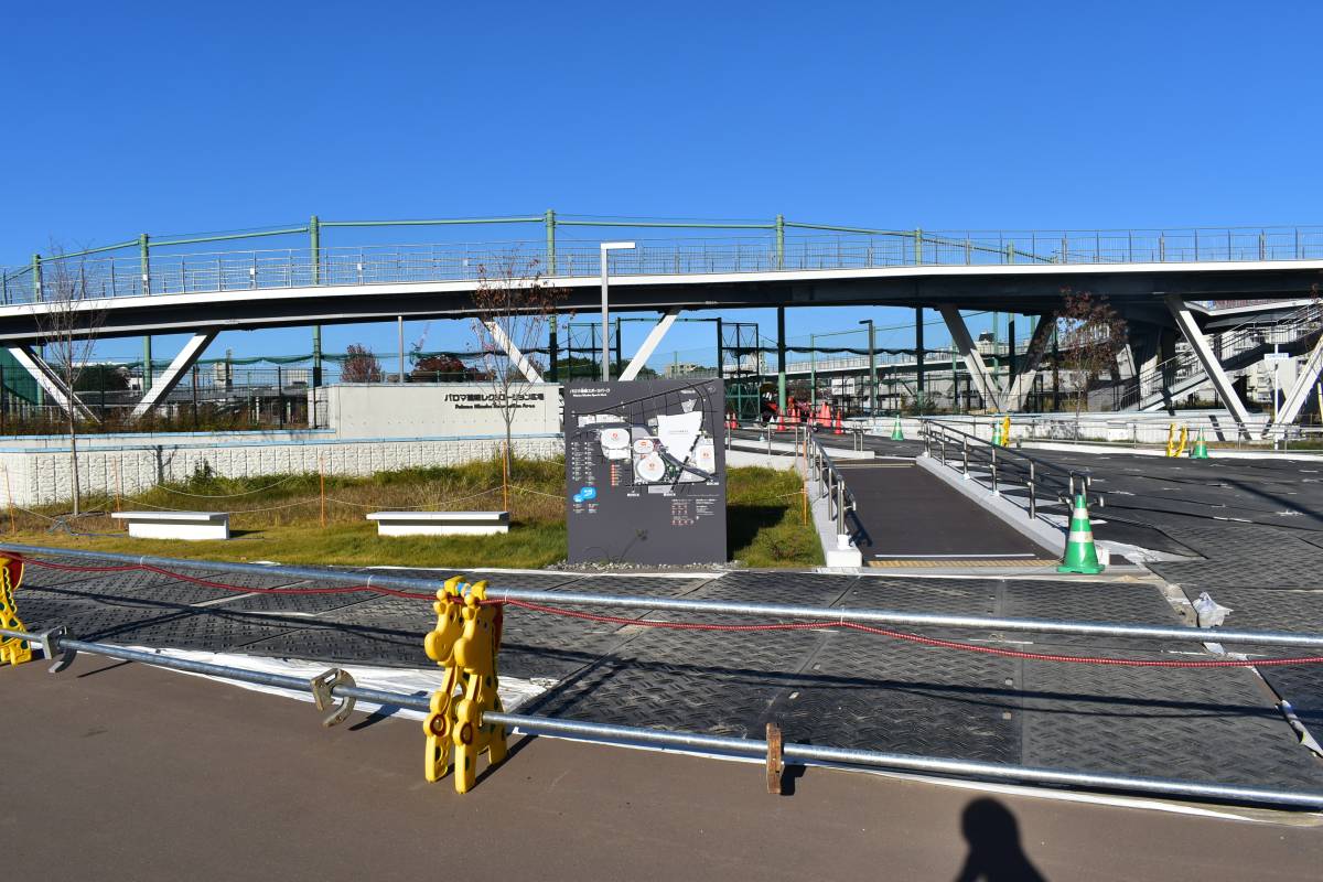 完成形になっていました。スタジアムから伸びるデッキと歩道橋もほぼ完成。入口は封鎖されていますがもう通れそうな感じです。