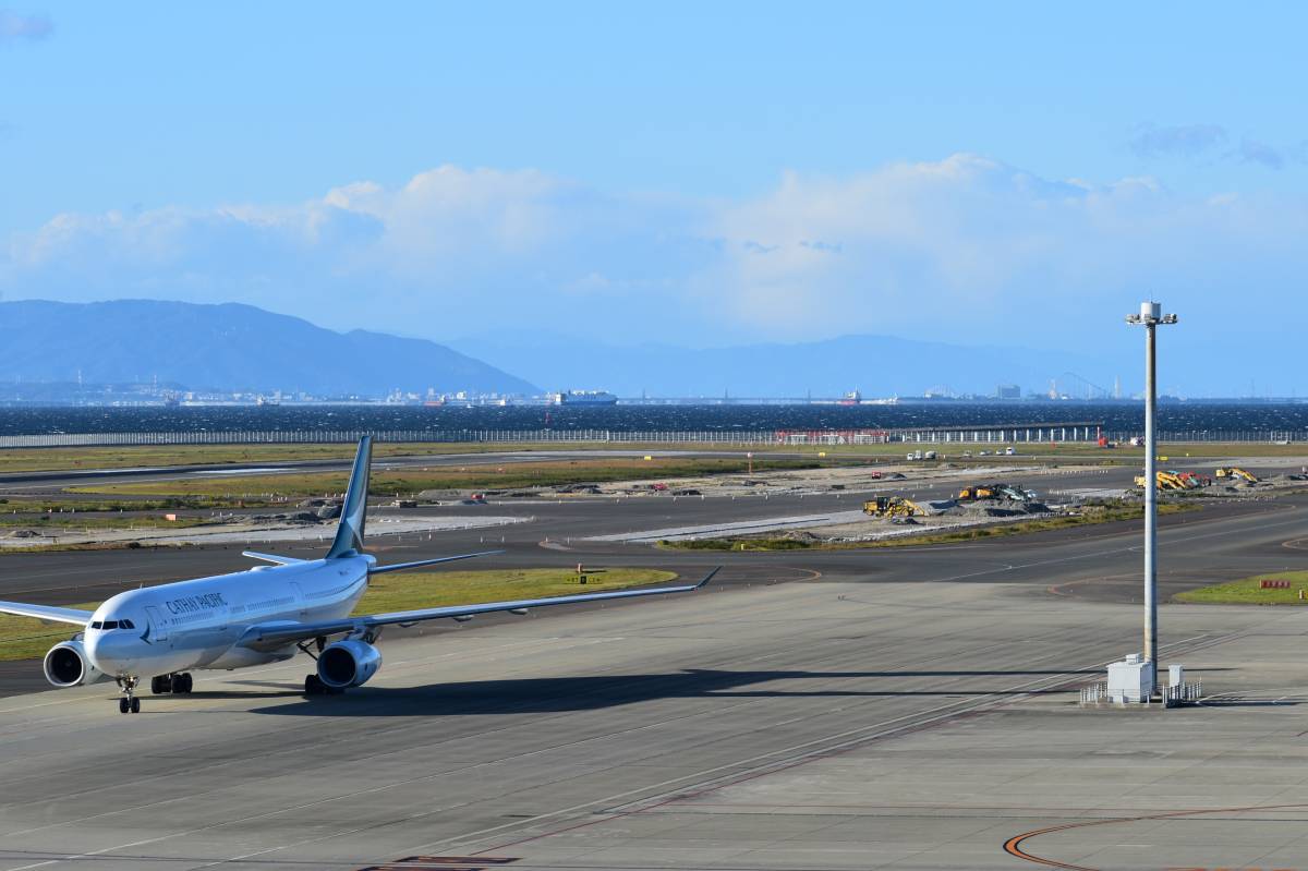 誘導路が工事中なので、着陸した飛行機は手前で折り返してスポットに戻ります。写っているのはキャセイパシフィックのA330-300です。オーストラリアへ行ったときに使いました。午後の数少ない大型機です。
