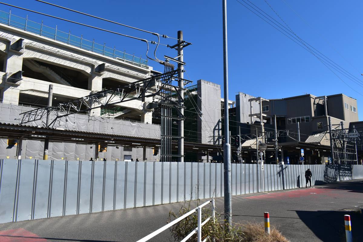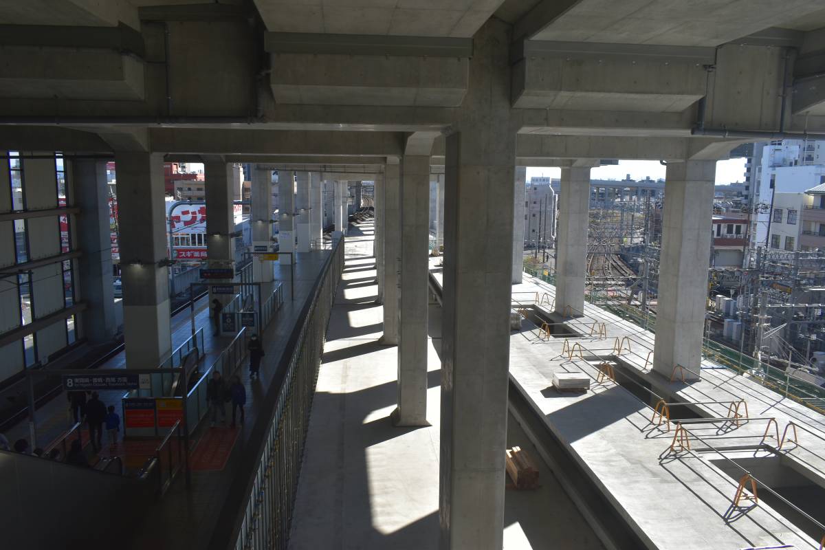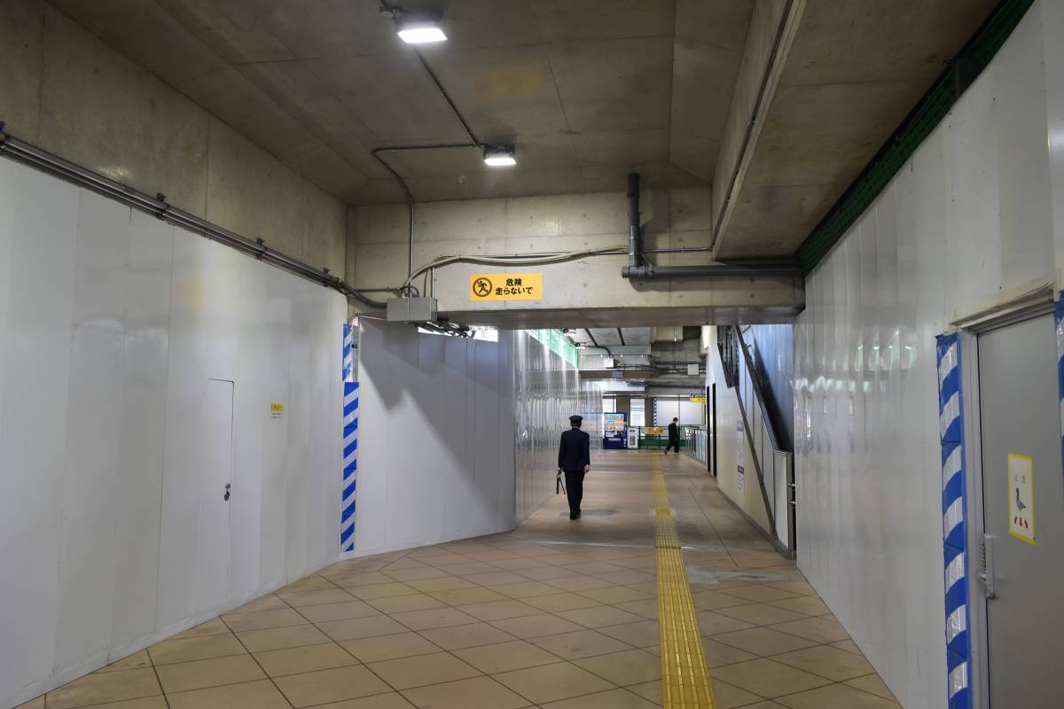 まずは駅の中の様子です。仮囲いが設置されて工事が進んでいます。ここの上に三河線が乗っかるため関連の工事中です。