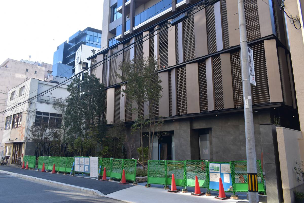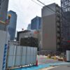 敷地東側の様子です。一部でフェンスが残っています。低層階は事務所機能となっています。外観がおしゃれですね。