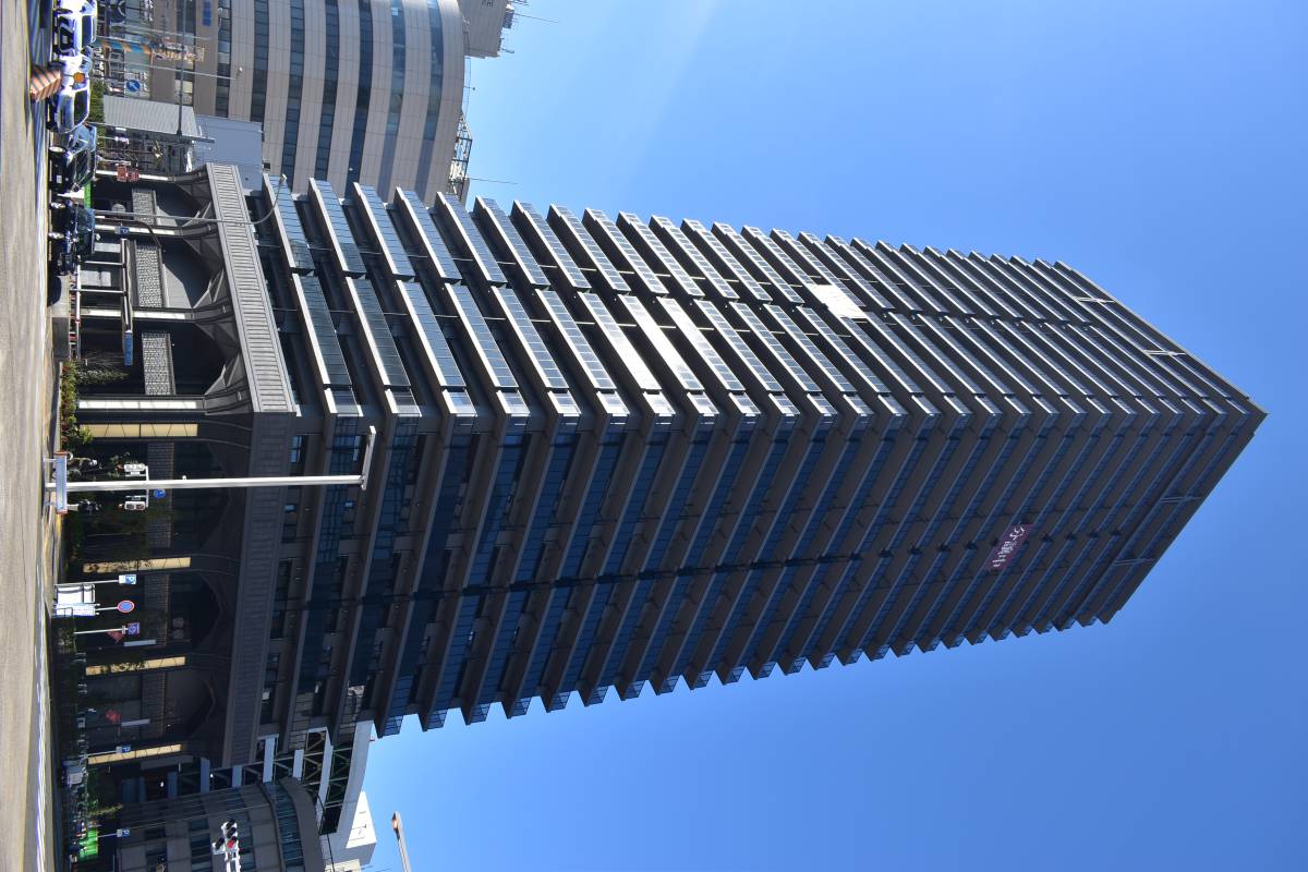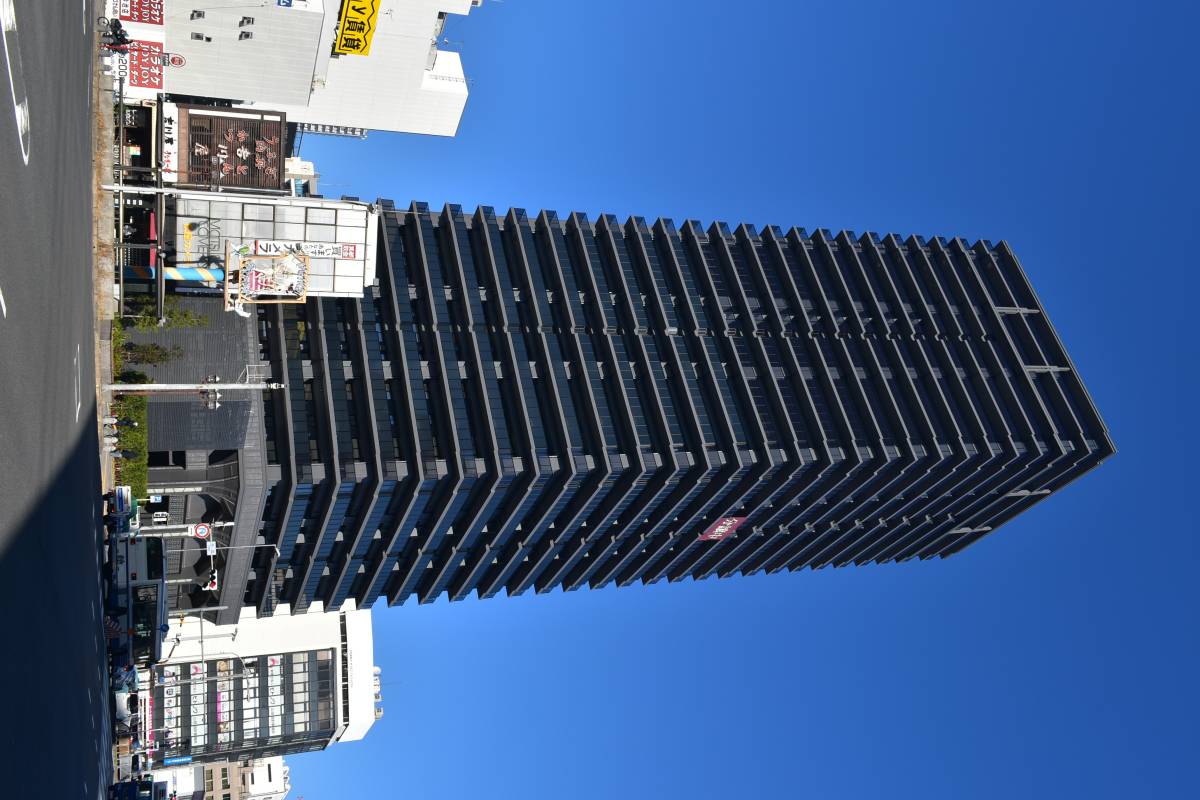 黒基調の高級感あるタワーマンションです。青空によく映えます。今池駅周辺には高い建物がなかったため圧倒的ランドマークになっています。