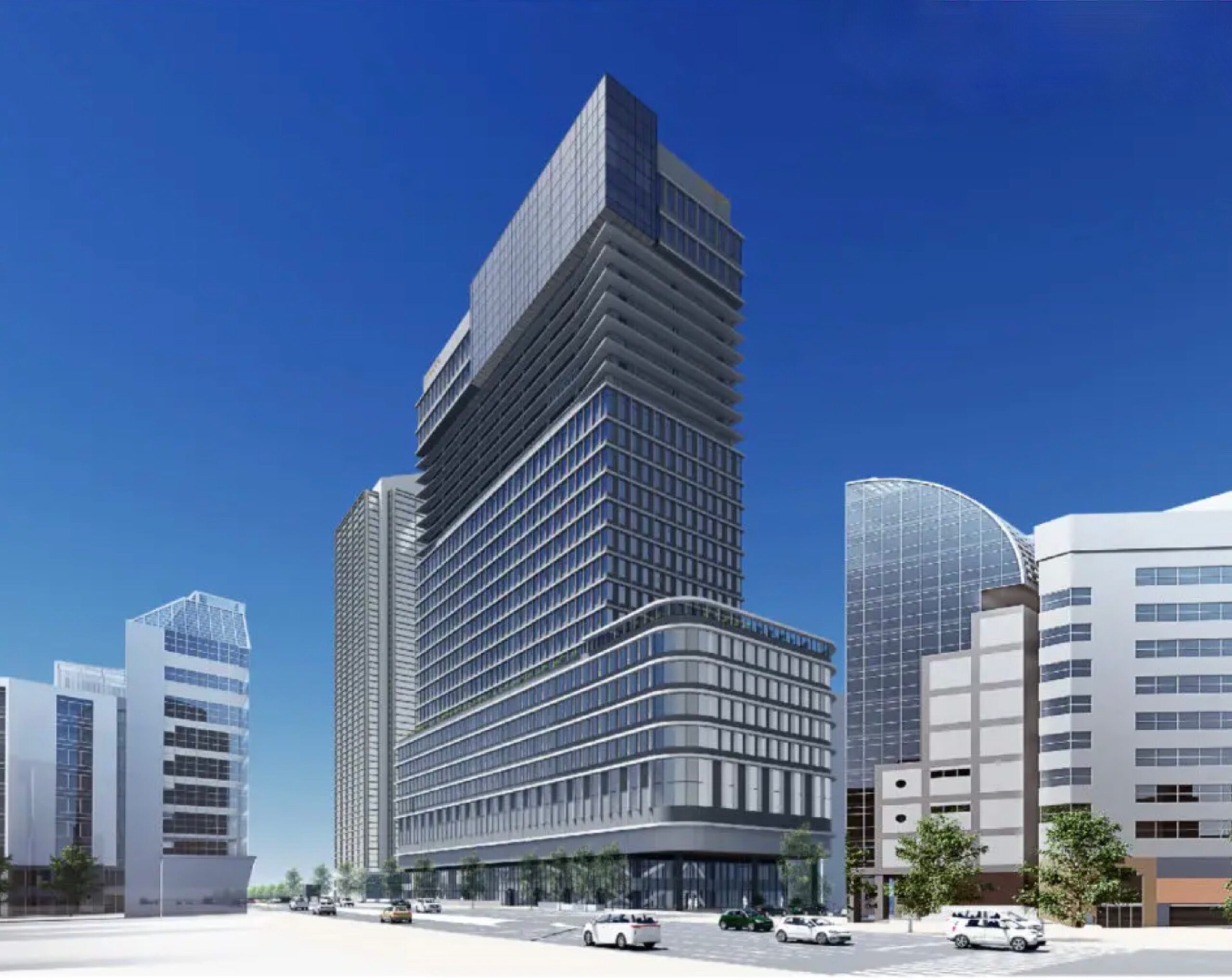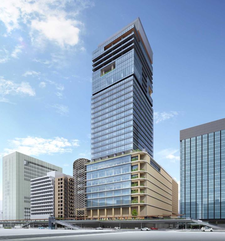 完成予想図です。長方形の建物ですが、いくつかのボリュームの箱を組み合わせたような姿が特徴的。高層部にはコンラッドが入ります。完成は2029年の予定です。