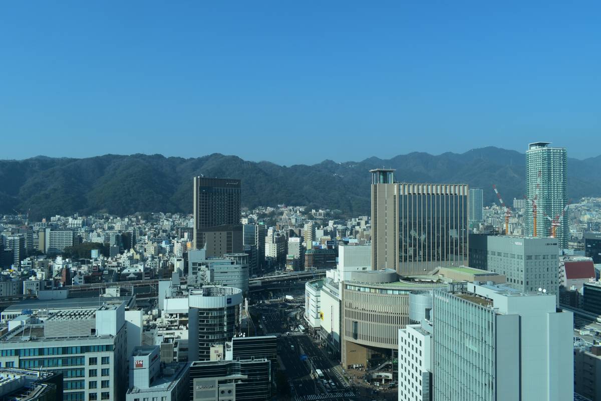 そして奥が三宮方面。阪急のビルが目立ちます。その後ろには六甲山地が迫っており、本当に山が近いことを実感します。山のふもとのあたりが異人街となっています。
