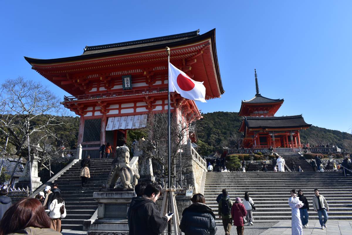 坂を上がったあたりまで来ました。快晴の青空に日の丸が映えます。観光客は一見少なく見えますが境内のあたりは混雑していました。清水寺は法相宗系の寺院で、京都の寺の中ではかなり歴史が古い方です。
