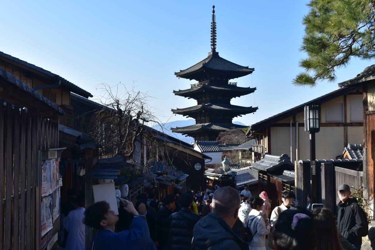 古い街並みの奥に見える法観寺の八坂の塔です。京都らしい風景としてよく紹介される景色です。大勢の人が写真を撮っていました。