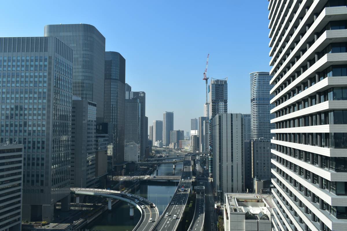 手前には高速道路が走ります。大都市ではスペースがないので川の上を有効活用して道路を通しています。この入り組んでいる感じもまた大都会という雰囲気につながっています。