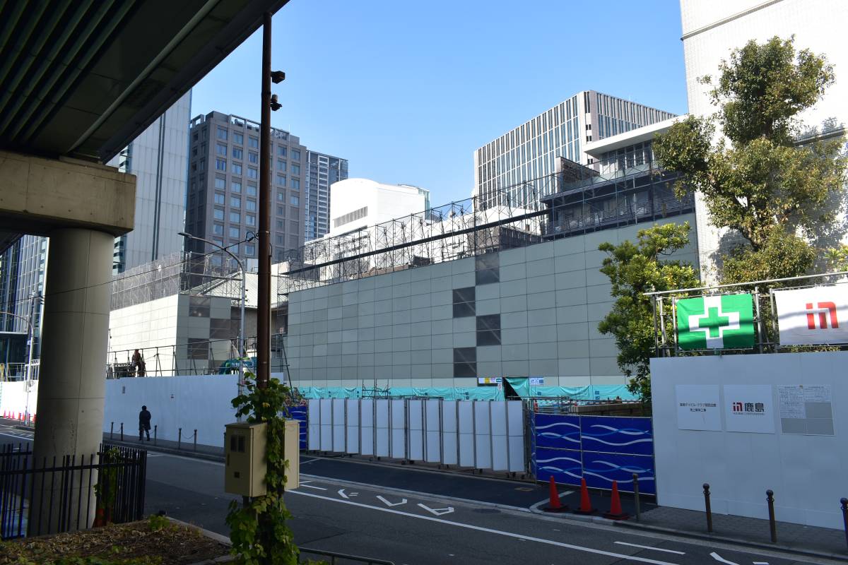 西に向かって歩きます。まずは先ほど紹介したホテルと隣接するクラブ関西の解体状況です。重機が入って工事が進んでいるようです。ただしホテルも解体があるため、工期は2028年までと長いです。