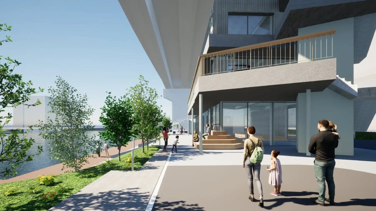 配置図です。①がホテル、②が店舗で、これらはキャナルルーフと呼ばれる大屋根でつながっています。③と④がコミュニティ施設で高速道路の下に建設されます。ここにも小さな屋根が設置され、大屋根のあるホテル棟と同じコンテクストの施設として一体感を演出します。