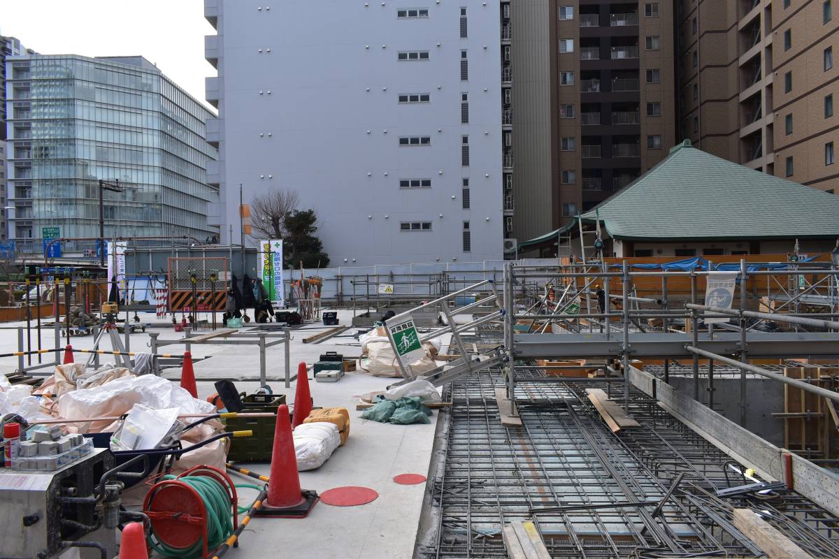 なので中も見放題です。左半分はコンクリートの打設が終わっているようです。右半分は鉄筋が組まれておりこれから打設がなされるのでしょう。