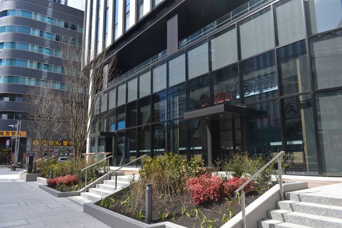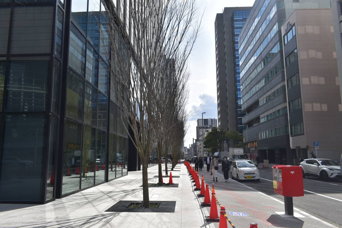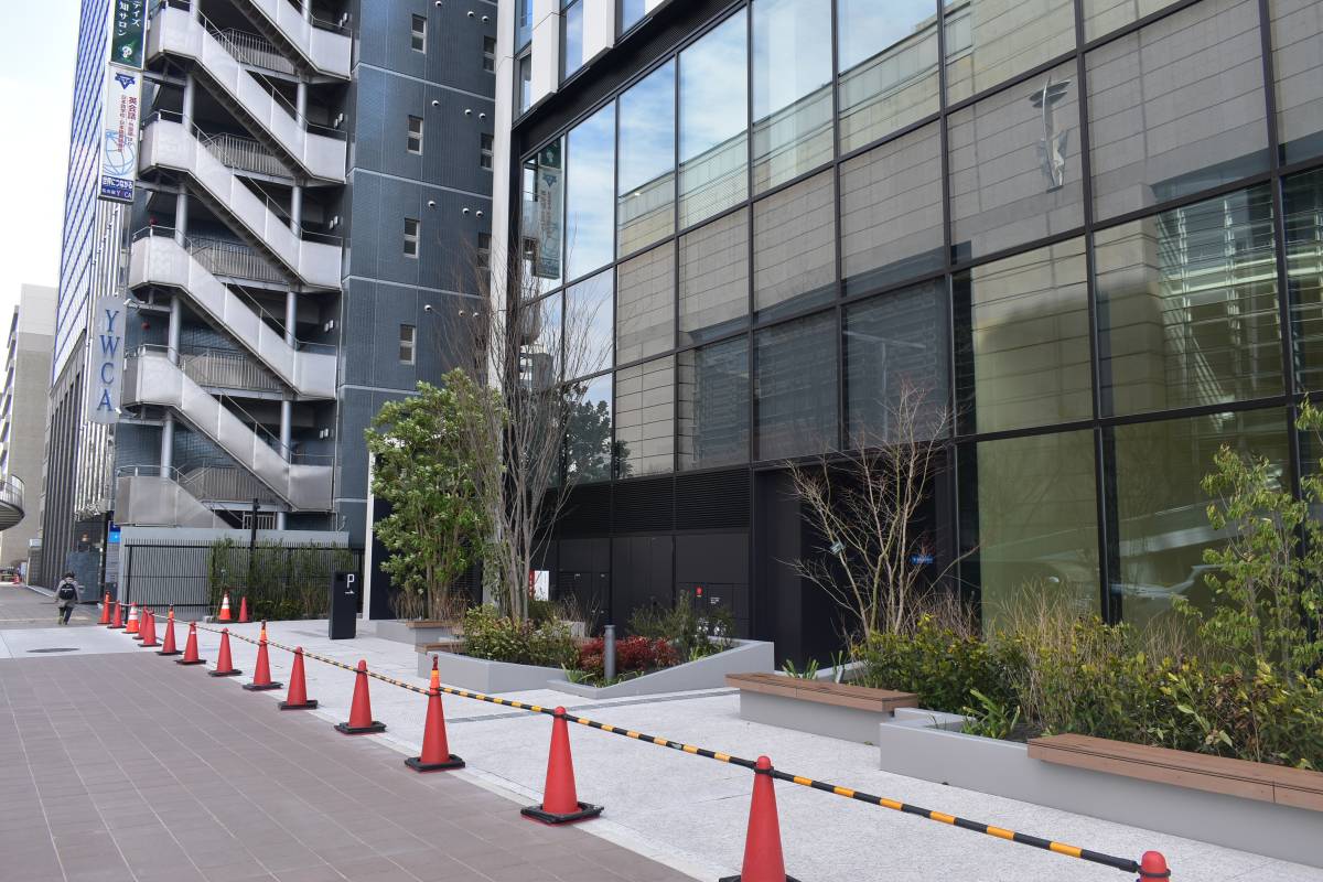 東面です。かなりセットバックされており歩道が広くなりました。一体開発のメリットはこういうところにも出てきます。