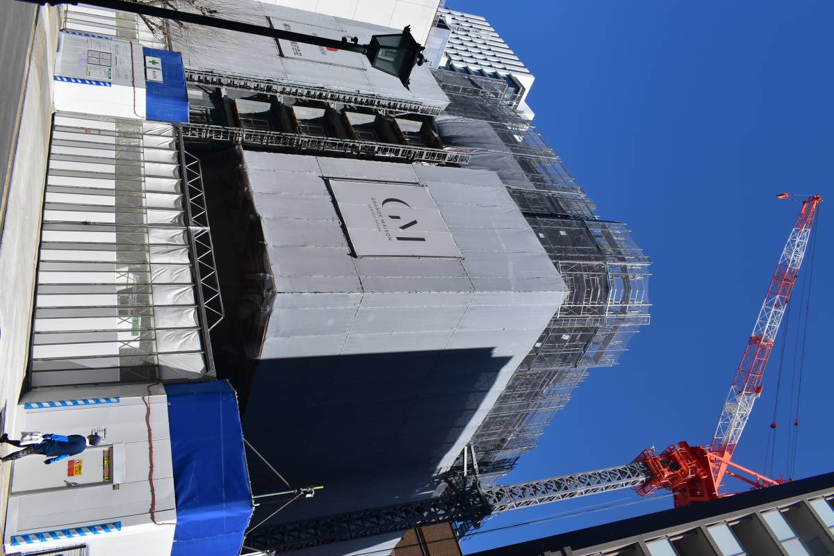 躯体は8階付近を構築中です。1か月で1.5階くらいのゆっくりとしたペースです。年明けに最上階到達くらいの感じだと思います。