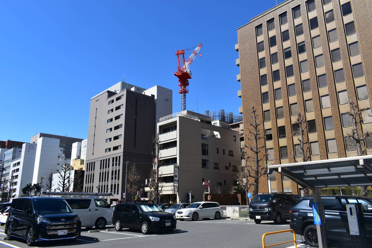 少し離れて見た様子です。タワークレーンが高くなりました。また本体の鉄筋も少し見えています。今後成長すればもっと離れたところから見ても存在感が出てくるでしょう。