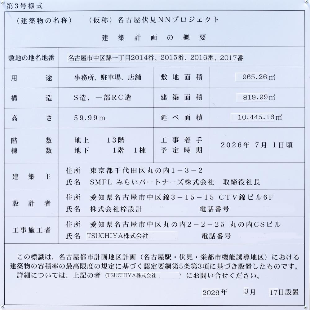 建築主はSMFLみらいパートナーズ、設計は梓設計です。施工会社はTSUCHIYAとなっています。TSUCHIYAは岐阜のゼネコンです。