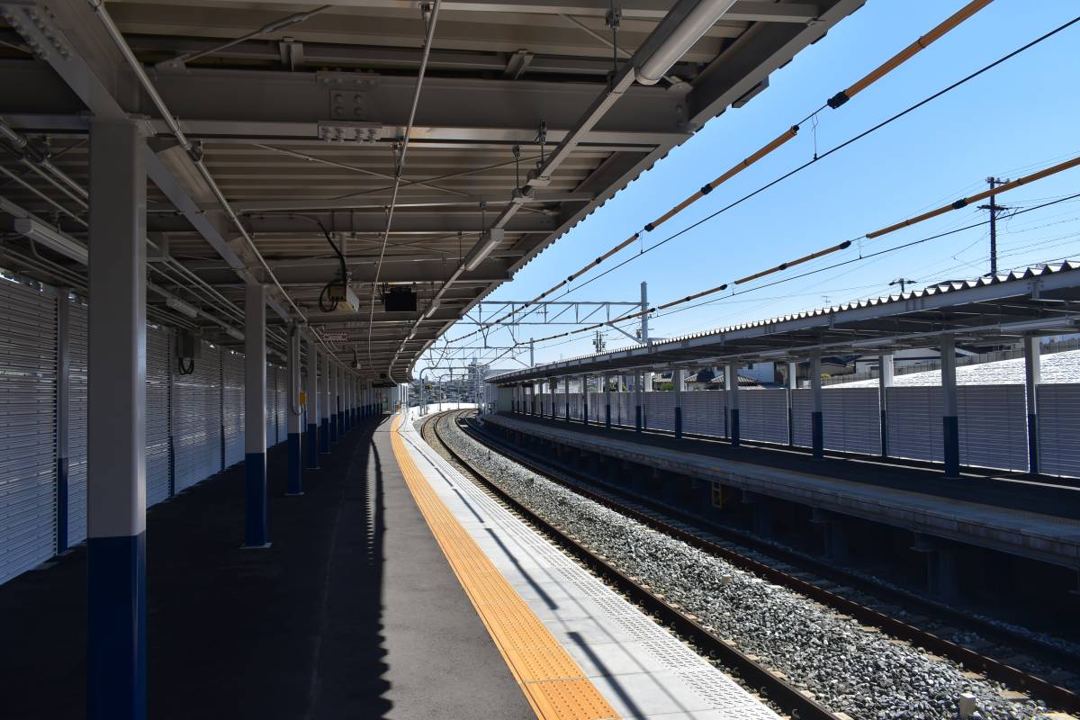 まずはホームの様子です。全体にわたって屋根が完成しました。上の記事を見るとわかりますが開業時は屋根は一部しかなく、ホームは白い仮囲いで囲われた暫定状態でした。