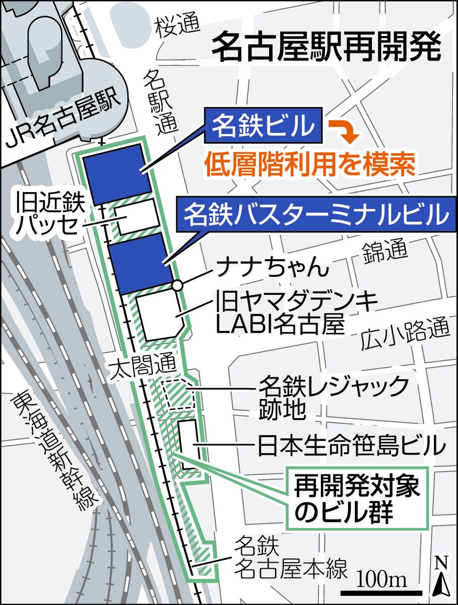 4月23日、中日新聞は名鉄百貨店のビルを少なくとも2030年3月まで存続させる方針と報じました。関係者への取材で明らかになったとのことです。ビル存続に伴い、6月下旬に中央改札前の百貨店本店本館の地下1階で、和菓子店などが10店舗ほど入る土産物売り場を開業する予定も判明しました。