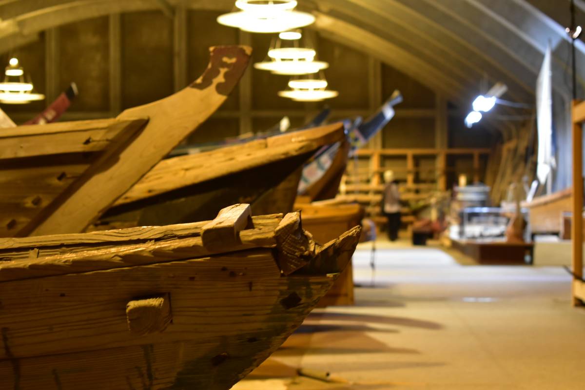 船の保存庫です。ここは昔使われていた船がたくさん置かれています。今の技術が発達する前は船は木でできていました。スギの木をメインに、ヒノキ、マツ、カシ、ケヤキなどで補った丈夫で速く走る船がたくさん造られました。
