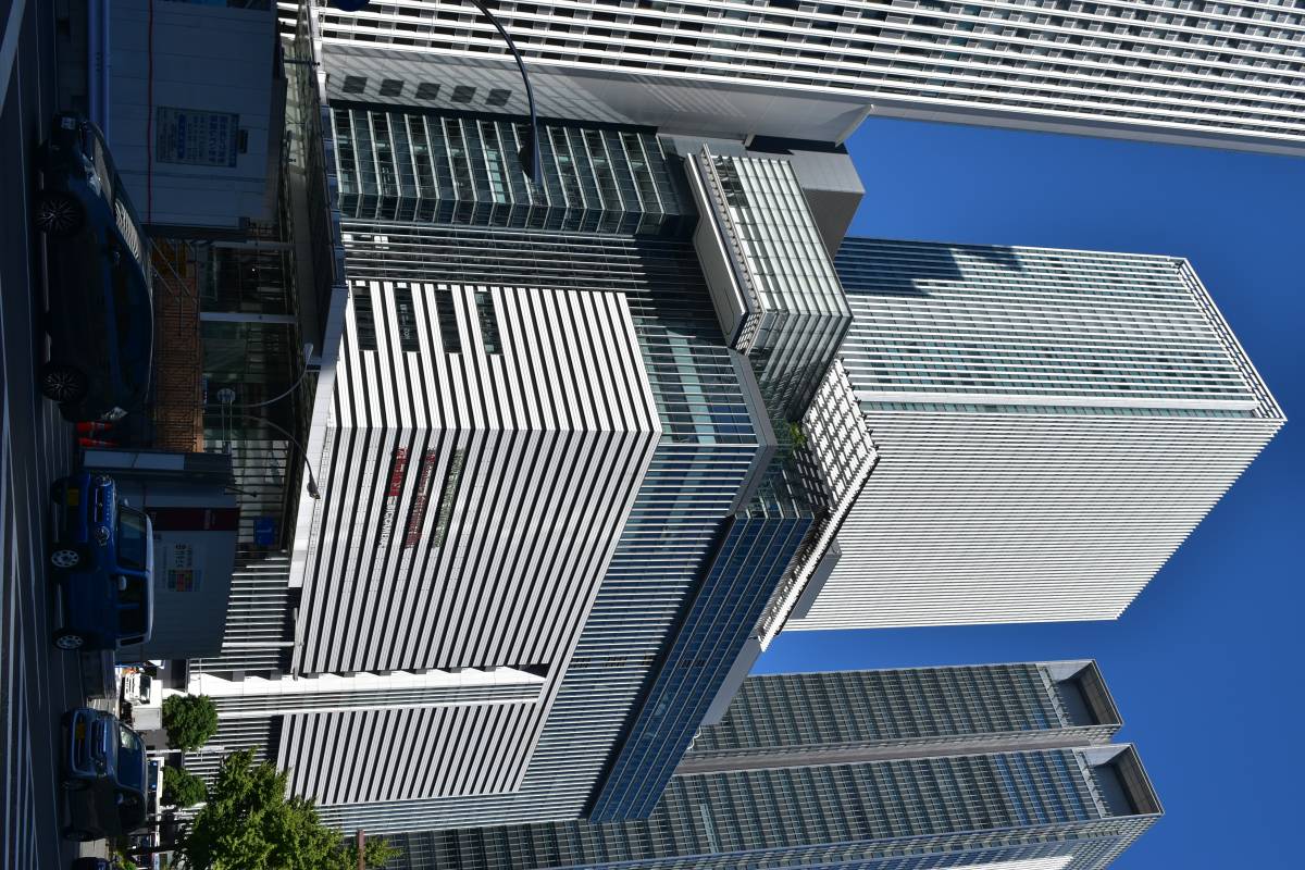 縦ルーバーが入っていないあたりはJR東海が運営するゲートタワーホテルです。その上がオフィス。高級ホテルが最上部にあるパターンが多いですがここはホテルを中間階に入れています。そのためホテルも高級というよりは駅直結の便利なシティホテルといったポジションです。
